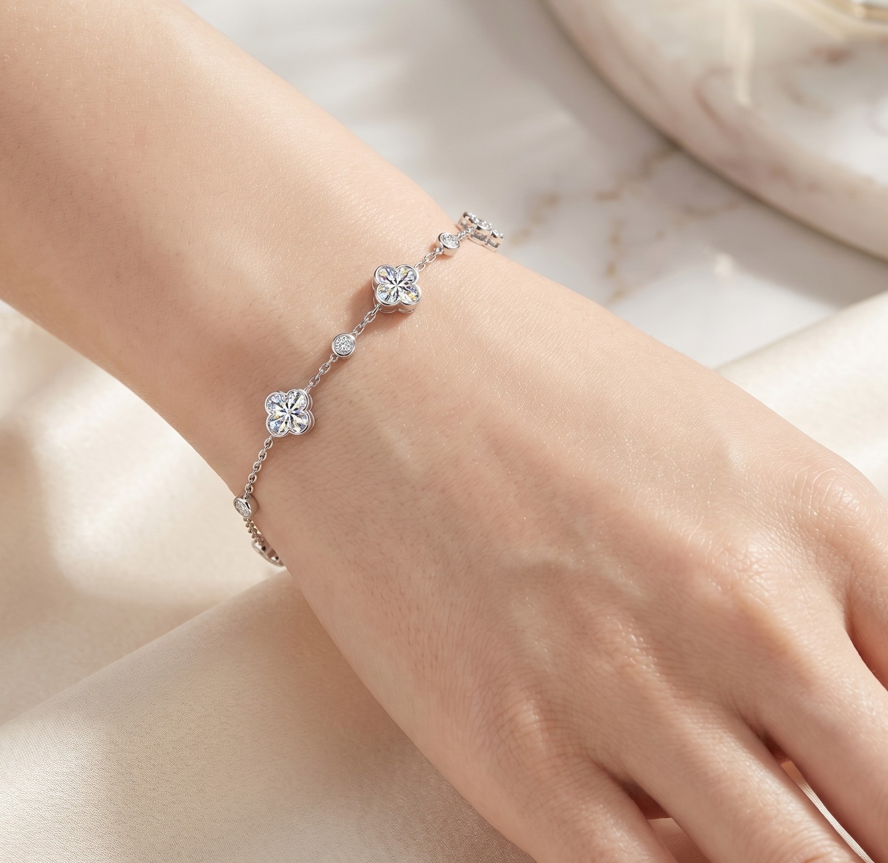6x6mm Signature Diamond Simulant, 4 Leafs Clover cut, alternated with 3mm Brilliant round on chain, Bezel set -Sterling Silver Rhodium Plated, Adjustable size 6″-7.5″