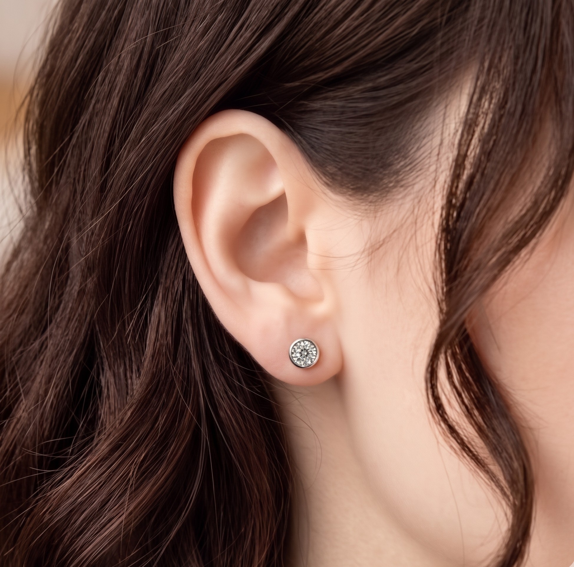 7mm. Signature Diamond Simulant, Brilliant round cut, Bezel set, Stud -Sterling Silver Rhodium Plated