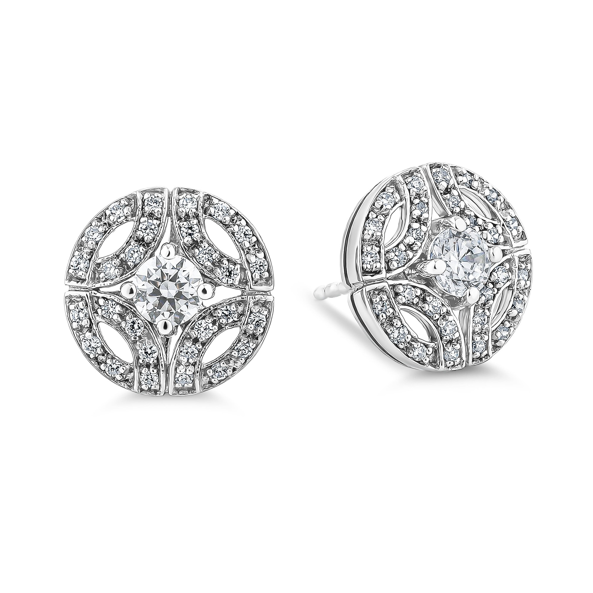 Each earring showcases a radiant 4mm Brilliant center stone, encircled by a dazzling halo of 44 petite 1mm round Diamond Simulants. The luxurious design is crafted in silver and rhodium plated, ensuring that these earrings not only shine brilliantly but also possess a refined allure. With a diameter of 11mm, these earrings offer the perfect balance of size and impact, making them a stunning addition to any bridal look.
