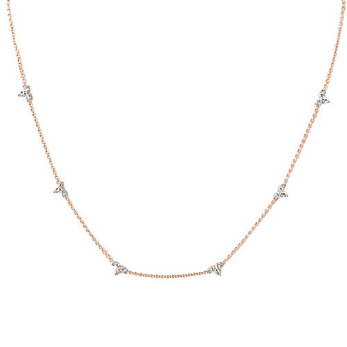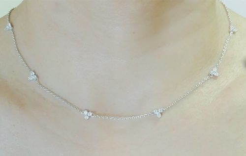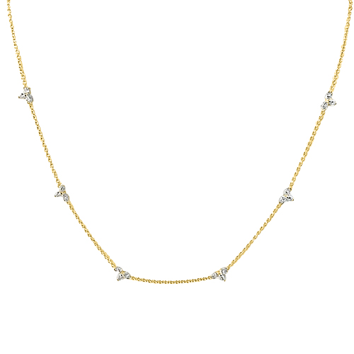 [woocommerce_currency_switcher_drop_down_box]A diamond necklace never goes out of style. This elegant necklace features dainty brilliant diamond simulants trios x 6 strung along a delicate Silver with 14K gold plated cable chain. An instant classic!