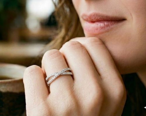 Cross over ring with pave