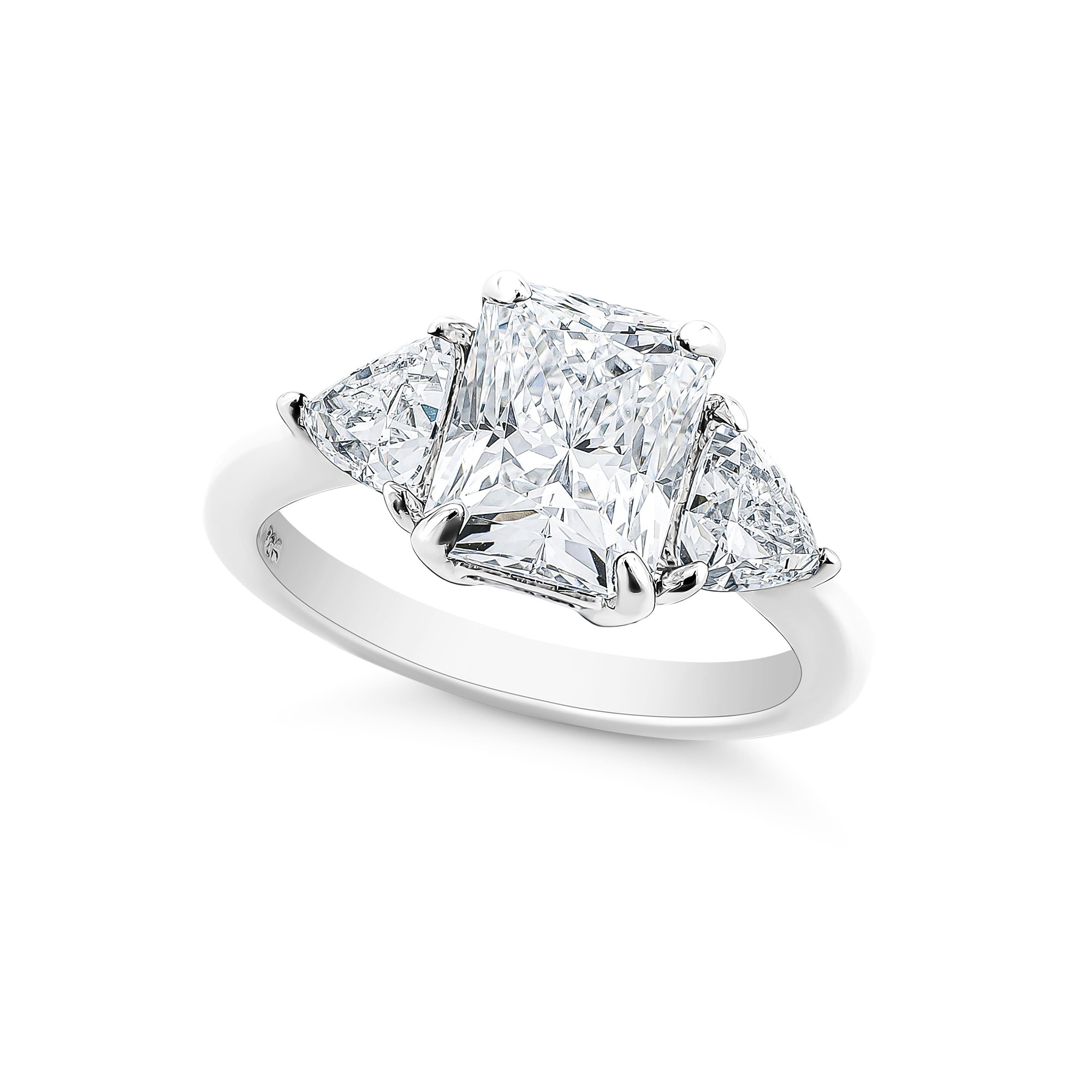 3-stone Radiant and Trillion Ring.  Twist on a three-stone ring.  Radiant cut diamond simulant is flanked by two Trillion cut side stones.  This ring features a low basket setting and subtle cathedral shoulders.