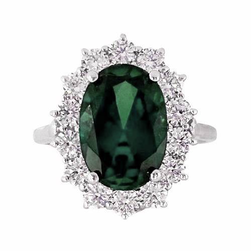 Ring Duchess with 13×9 mm Lab-Created Blue Sapphire color, Oval shape with 4 prongs surrounded by 3 mm x 12 pcs Lab-Created Diamond Simulants ,Prongs set. Plain band. Sterling Silver Rhodium Plated.