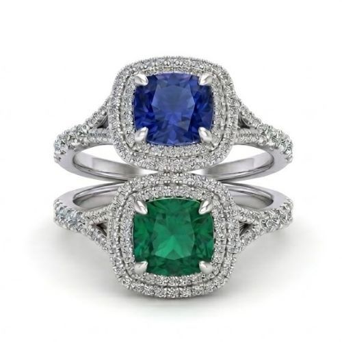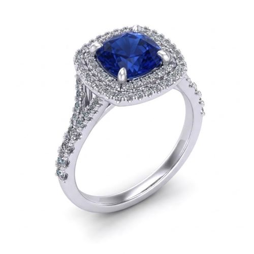 Ring Double Halo 7x7mm Lab-Created Diamond Simulants, Cushion cut in the center surrounded by double row of 1 mm and 1.25, 1.75 and 2 mm Brilliant cut on either band, Sterling Silver Rhodium Plated